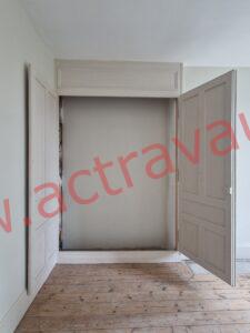 reprise des portes intérieures + de la porte massive en bois recto/verso, des plinthes moulurées, des divers placards, des tablettes en bois + mise en peinture en couleur...+ mise en peinture des volets en façade avant ... etc etc...