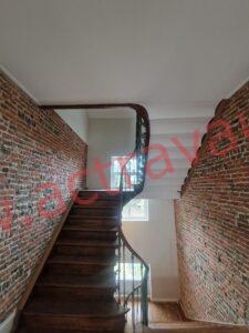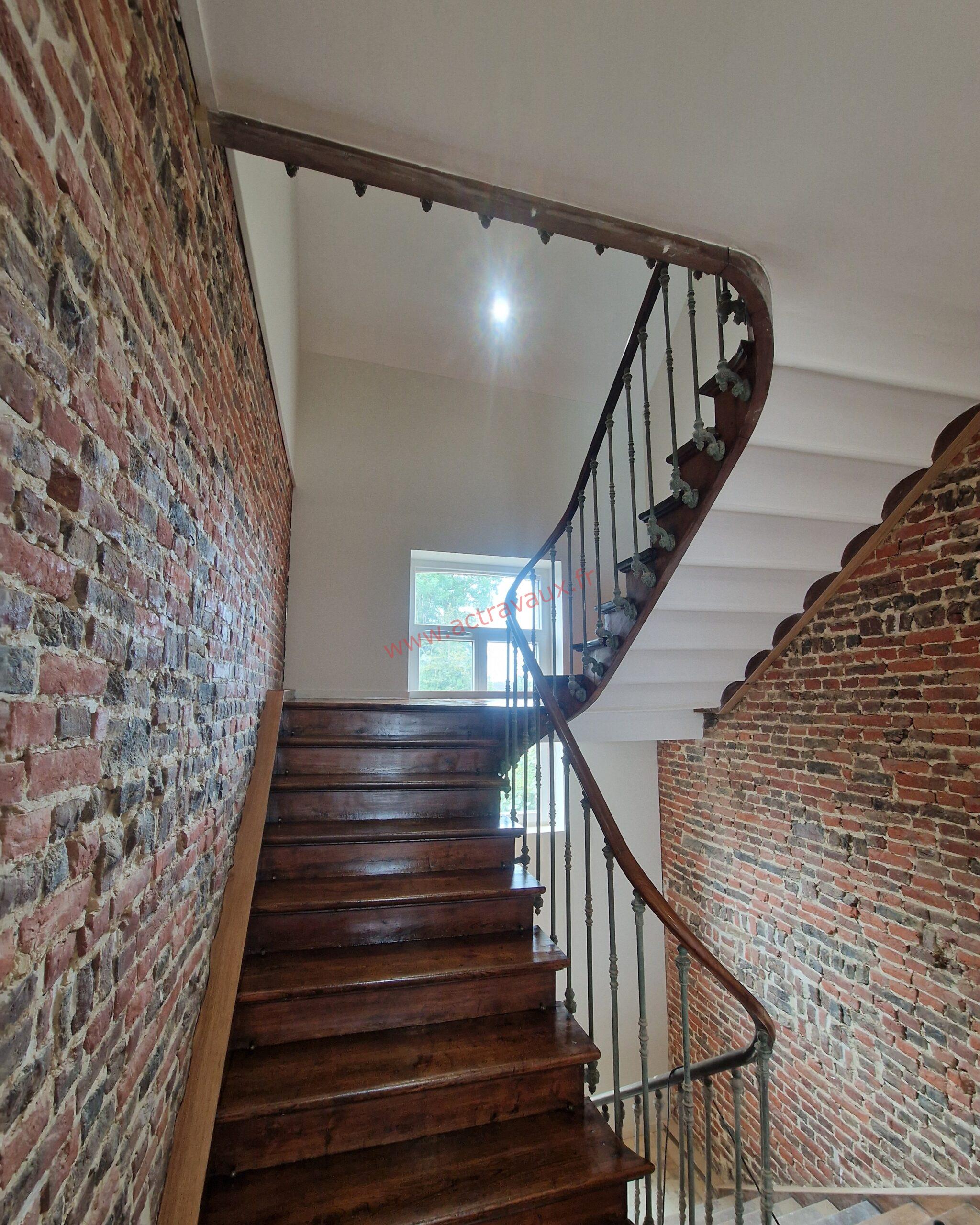 # Maçonnerie avec la partie démolition dépose torchis/évacuation déblais... nouveau cimentage bas murs...etc... + rejointoiement des murs intérieurs en Briques + vernis (c'est magnifique)